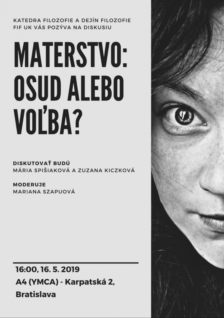 Ďalšia z filozofických diskusií bude venovaná téme materstva. Ako súvisí materstvo so ženskou identitou: je určujúcou charakteristikou ženy? Je materstvo poslaním žien?